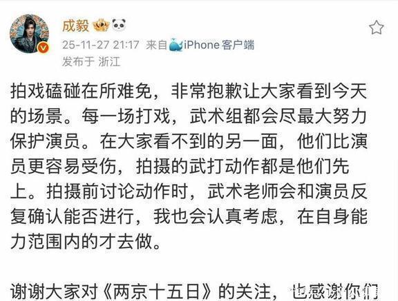 事儿出了之后,成毅还反过来安慰大家,说自己没事。这孩子也太善良了,还专门发了消息跟大伙儿报平安,顺便解释了几句。唉,当时看那个视频的时候,真是看着都觉得肉疼。